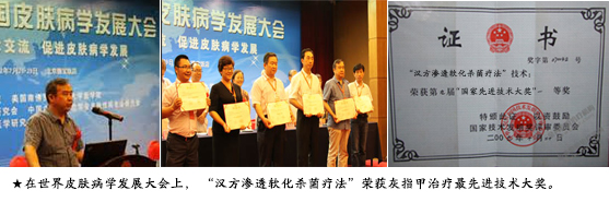 2009年世界皮肤病学发展大会上, “汉方渗透软化杀菌疗法”荣获灰指甲治疗先进技术大奖,同时也给广大灰指甲患者发出一个讯号,灰指甲难治疗难题现已攻克。获悉,“汉方渗透软化杀菌疗法”对治疗灰指甲有独特疗效,具有深层杀菌、调节易感基因及激活免疫三重功效,改变了药物治疗的弊端,解决了其不能准确彻底杀菌的难题,使治疗效果更有保证。