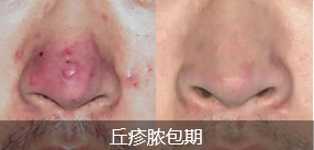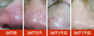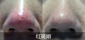 治疗效果:经过几个疗程的治疗后,鼻头部位黑头、丘疹、脓疱都消失了,只遗留有轻微皮肤发红,经巩固治疗一个周期后,症状完全消失.
