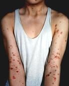 3、1-2周后,躯干和四肢近端出现甲盖大小散在分布的斑疹.